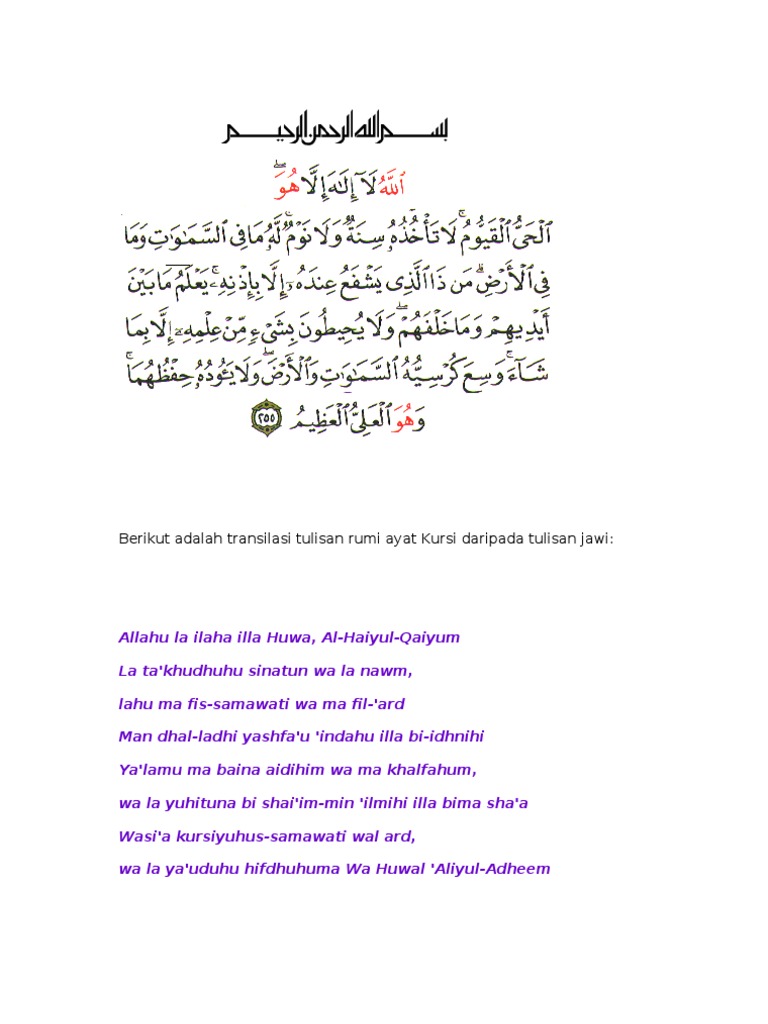 Ayatul kursi beserta rumi bagi memudahkan bacaan dan hafalan pada mereka yang baru bermula. Tentang mandi atas sebab. Oleh itu segala apa yang ada disekalian alam ini adalah hamba dan milik-Nya.